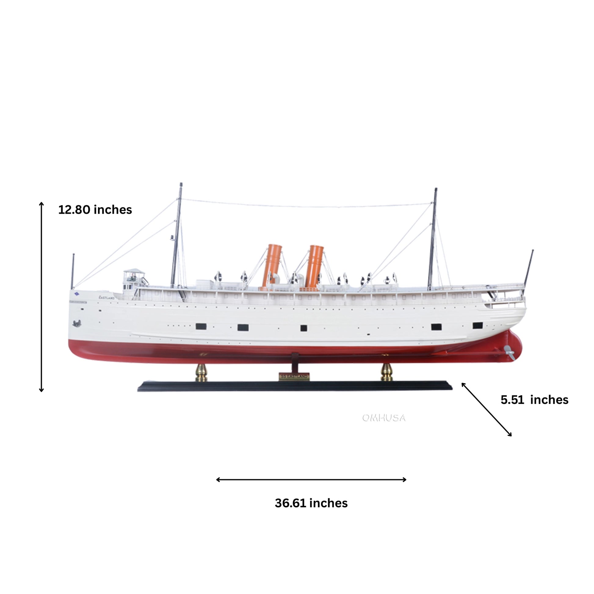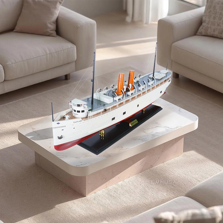 On July 24, 1915, while passengers were boarding for a company outing in the Chicago River, the SS Eastland unexpectedly rolled over, sinking quickly and tragically trapping many aboard. Over 800 lives were lost, making it one of the deadliest maritime disasters in U.S. history and prompting nationwide attention to passenger ship safety. The disaster led to major changes in safety regulations for passenger vessels, influencing ship design and boarding procedures for years to come. Today, the SS Eastland remains a poignant symbol of both luxury and tragedy on the Great Lakes, and its story is preserved through historical accounts, museums, and highly detailed models like this handcrafted replica.