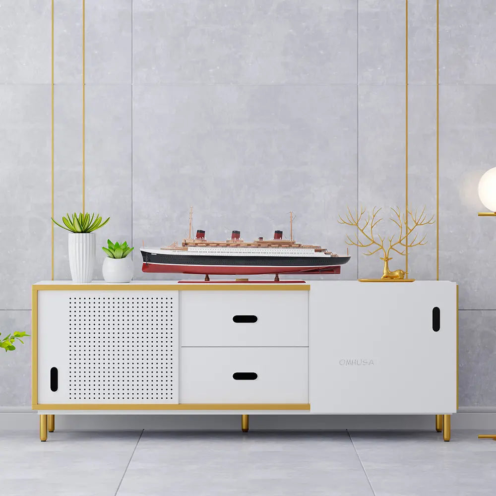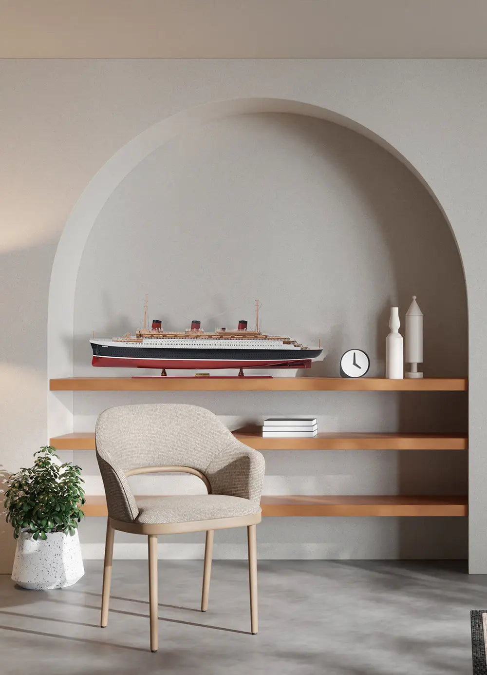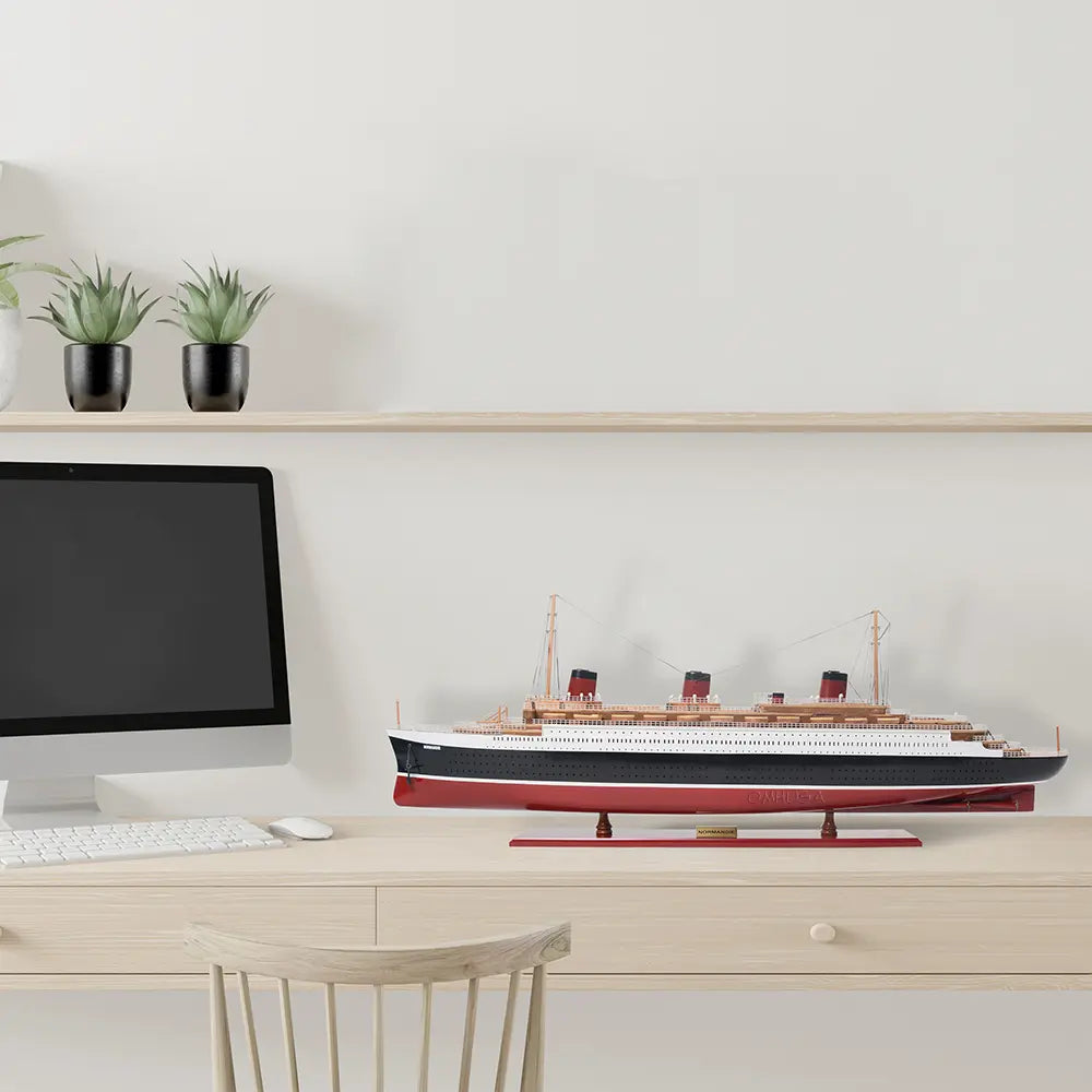 Hundreds of detailed pieces went into the construction of this model. There are multiple wood decks. You can see hundreds of open windows along the hull. Layers of stanchions with guardrails are placed all around the deck. Three magnificent smoke stacks with chimneys are carefully painted in red and black. Dozens of wooden lifeboats are all meticulously hand built according to scale.