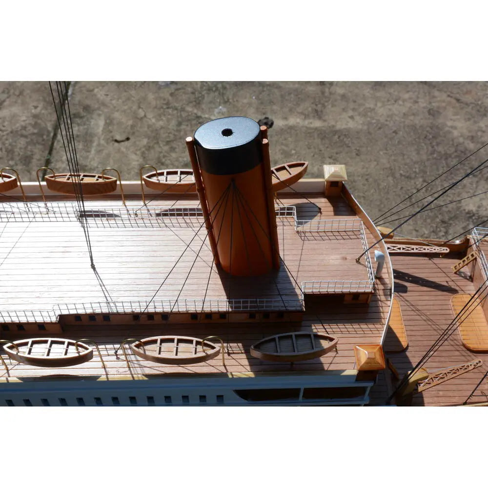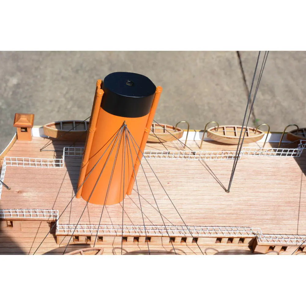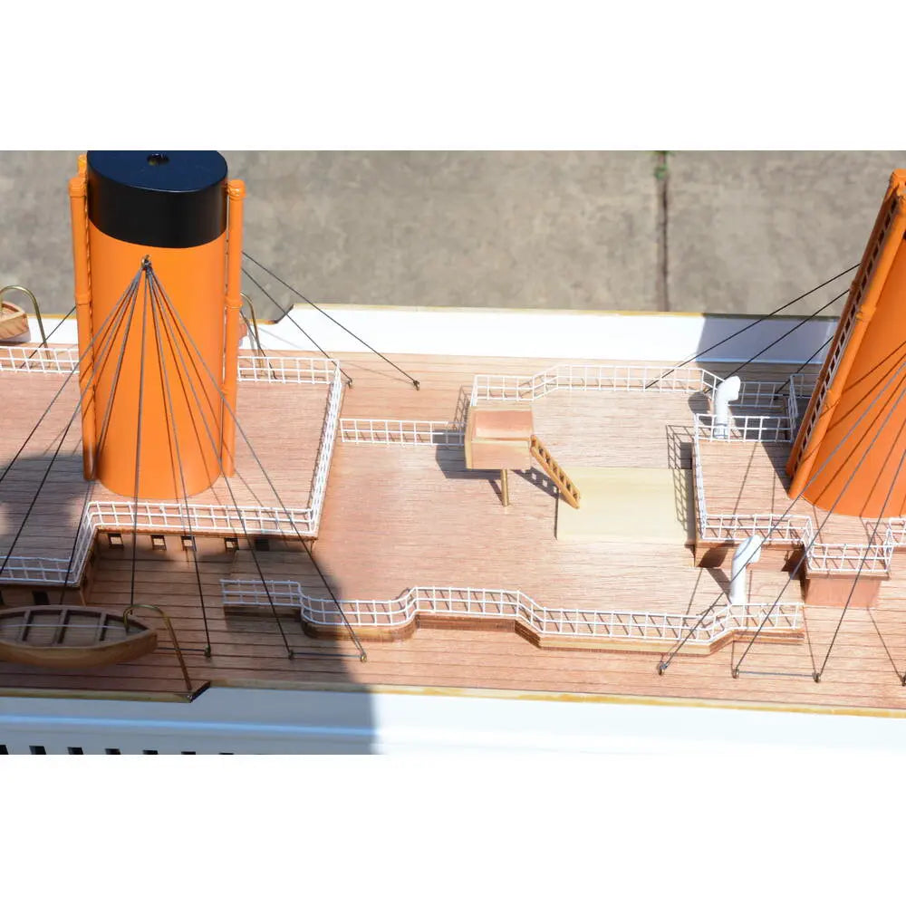 Painted in its iconic red, white, and black color scheme, the model meticulously replicates the Titanic’s majestic presence. It features finely detailed plank decking, sturdy metal railings, multiple lifeboats, davits, and precisely crafted metal stairs. The four towering smokestacks are painted with precision, adding to the model’s authenticity. Anchors, advanced rigging, and delicate structural elements further enhance its realistic appearance.
