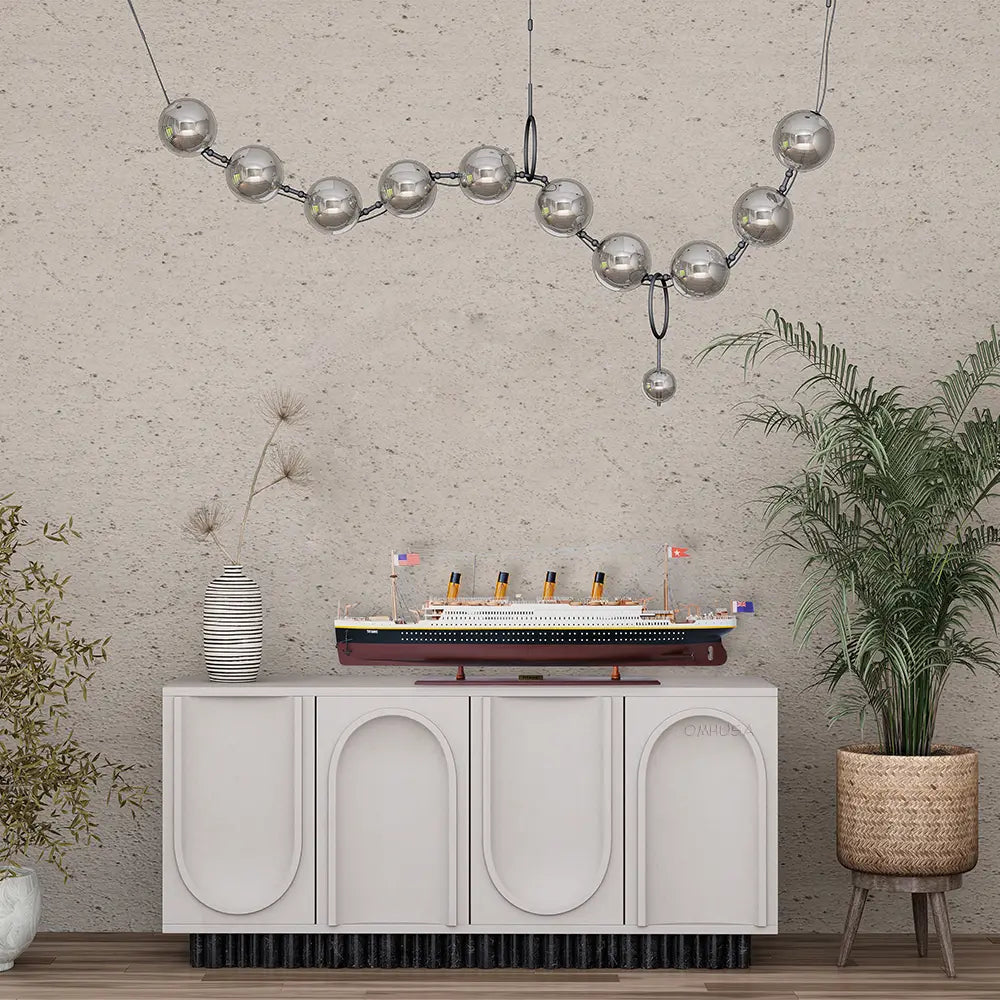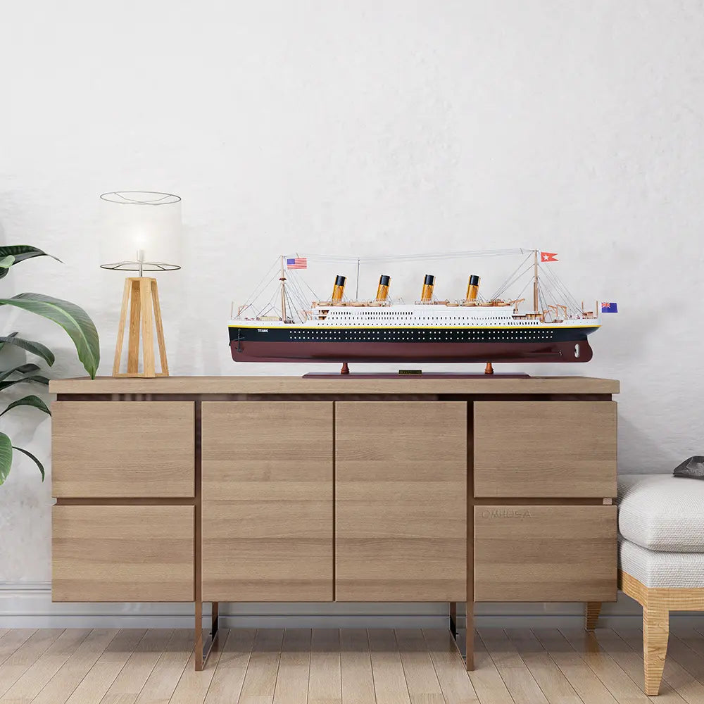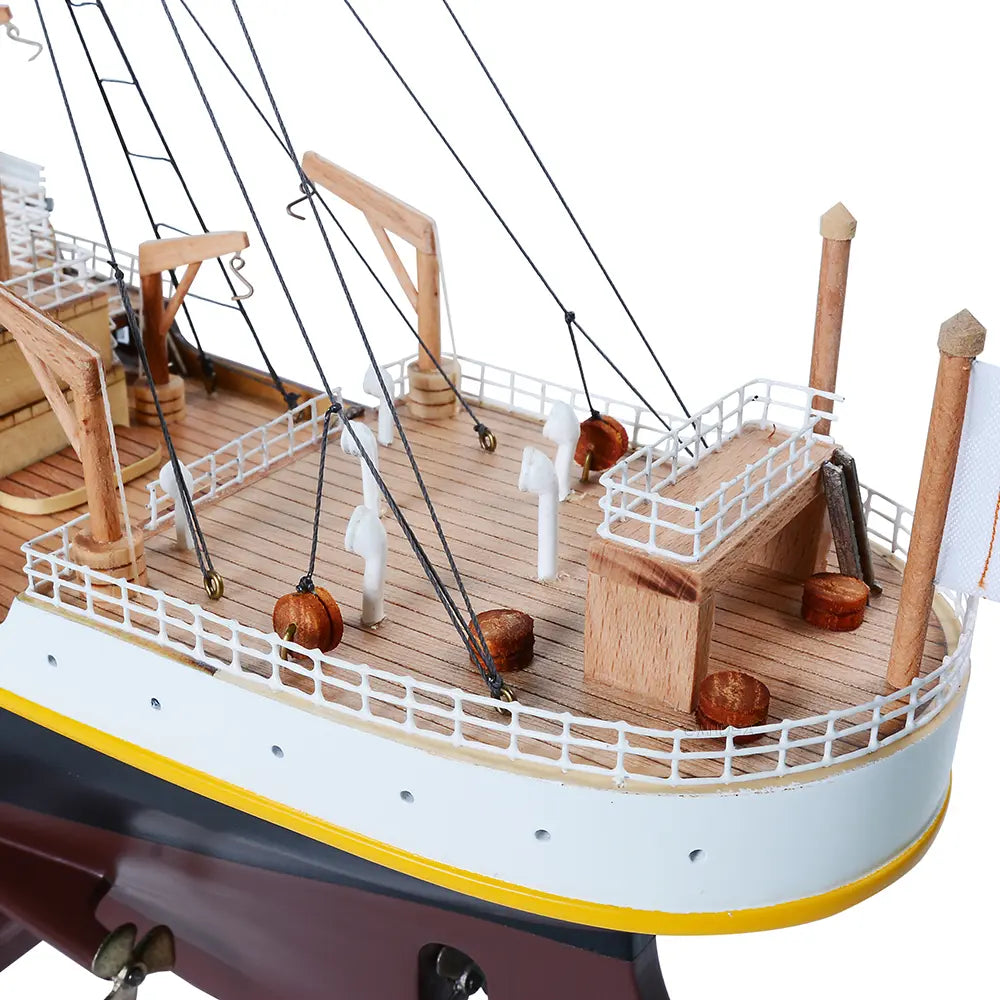 The model is painted in red, black, and white to represent the original colors of Titanic. You can find hundreds of intricate details on this model. All lifeboats are meticulously handcrafted from wood. All riggings are accurately built according to scale. The intricate pieces such as: the crane, anchors, stanchions, windows, ladders, steam pipes, and skylight really make this model a master piece.