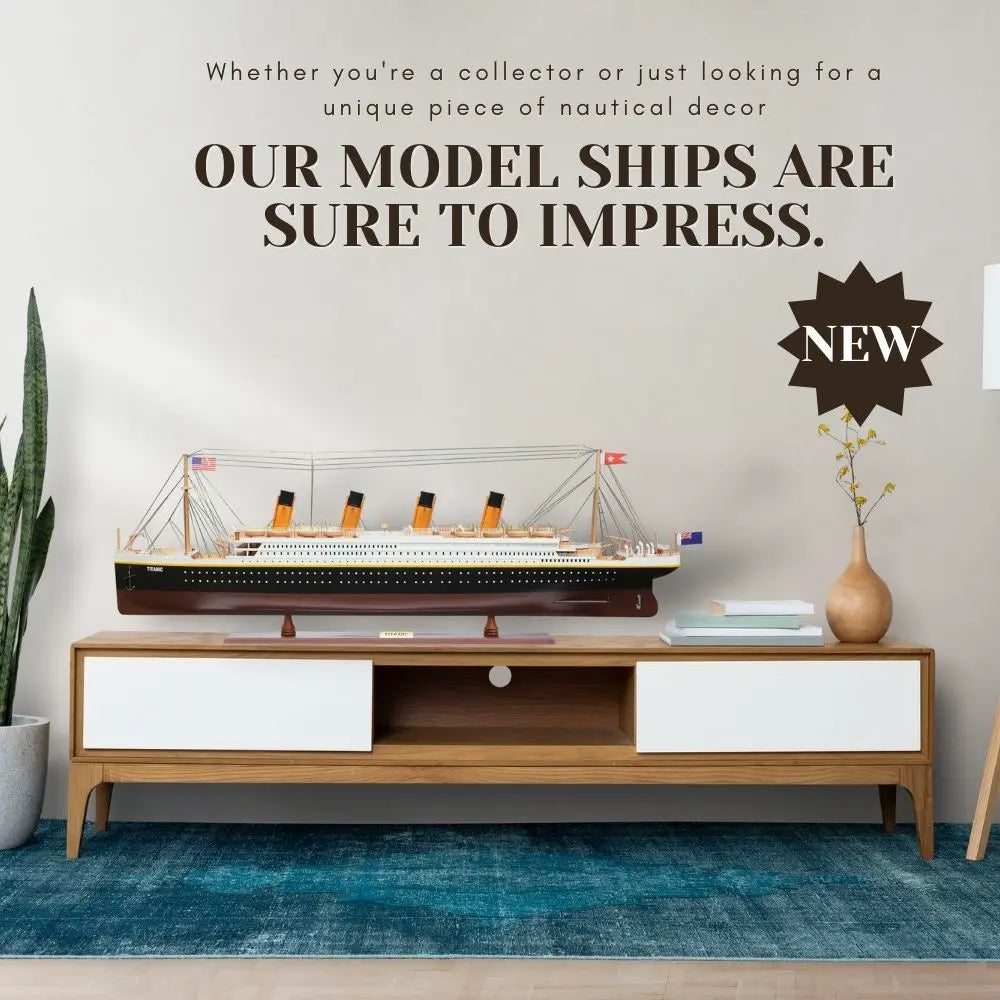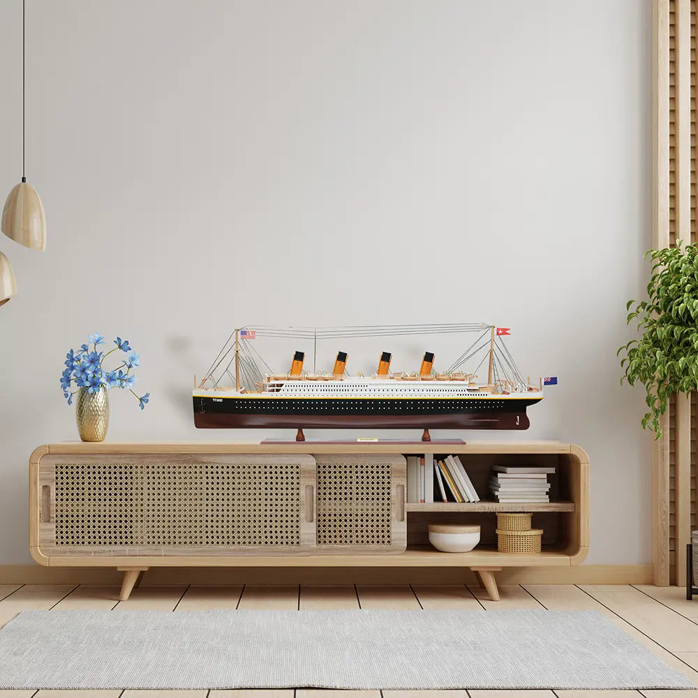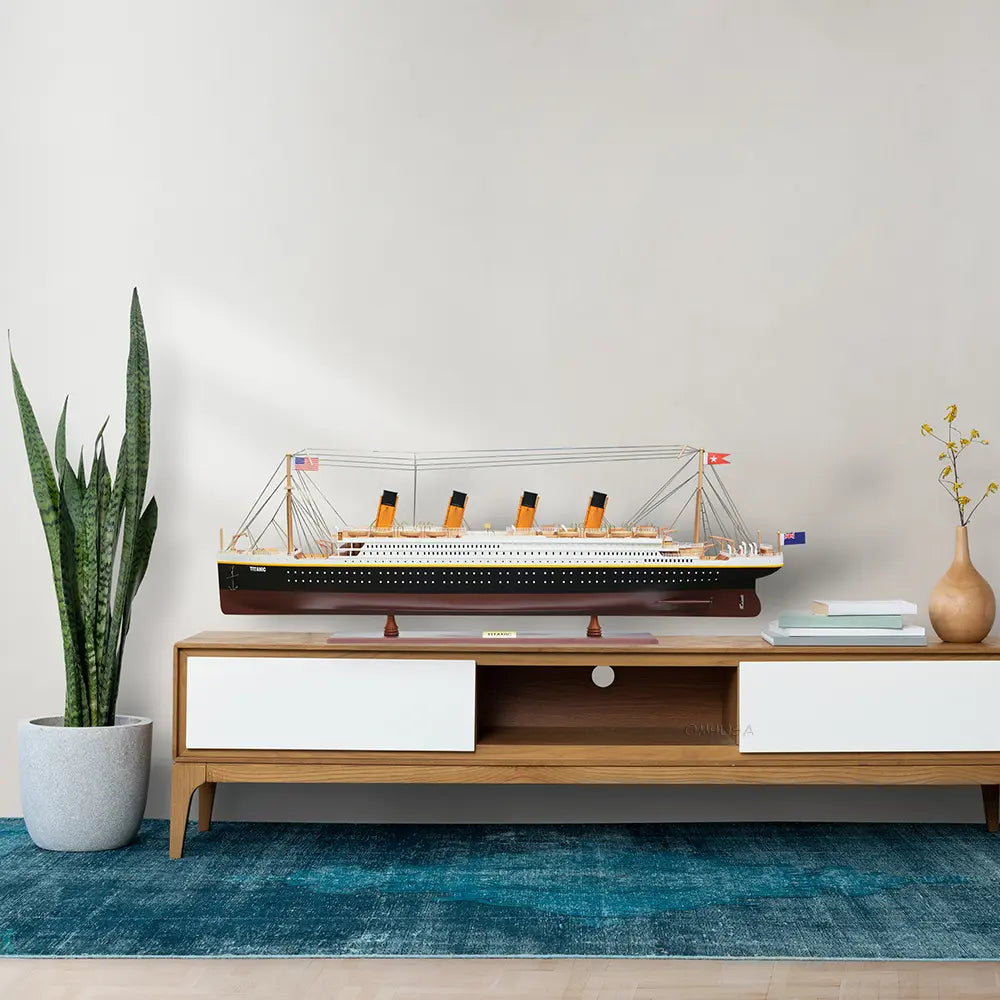 It has magnificent details which include plank decking, metal rails, multiple life boats, davits, metal stairs, painted smoked stacks, anchors, and advanced rigging. Come with US, UK and white star flags. The word Titanic and home port Liverpool are painted on the hull. Rest on a solid wood base with metal nameplate.